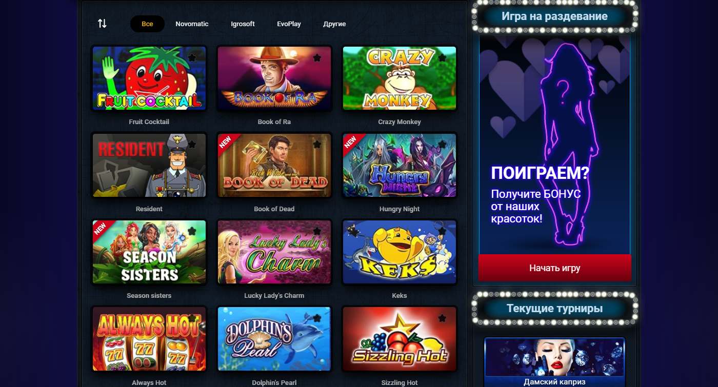 - Софт: Novomatic, Igrosoft, Belatra, Mega Jack, EvoPlay, Microgaming